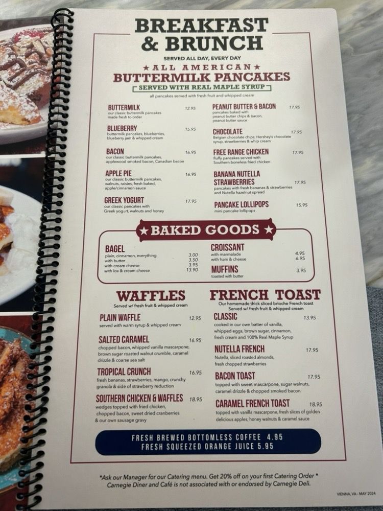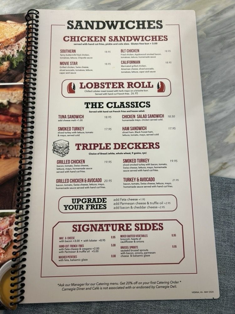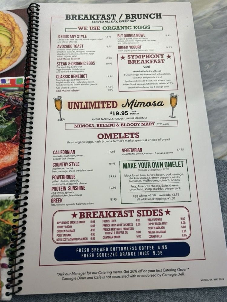Introducing the menu at Carnegie Diner & Cafe, located at 501 Maple Ave W in Vienna, VA. This diner-cafe offers a variety of breakfast options, including Avocado Toast, Steak & Eggs, Classic Benedict, and Bagels & Spreads. Customers can also enjoy breakfast sides like Applewood Smoked Bacon, Small Cup Fresh Fruits, and Side of Lobster. The menu is diverse, with options for every taste preference.